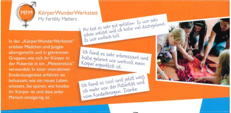 Der interaktive Mitmach-Workshop "KörperWunderWerkstatt" ist das Angebot des MFMProgramms für die Grundschule. Im Grundschullehrplan geht es um eine erste Einführung in die Themen Pubertät, Körper von Frau und Mann und die Entstehung neuen Lebens. Genau das bietet der 4stündiger KörperWunderWerkstatt-Workshop. In diesem interaktiven Mitmach-Workshop, in geschlechtergetrennten Gruppen, wird vor allem die emotionale Ebene angesprochen und das Staunen über das "Meisterstück", den eigenen Körper.